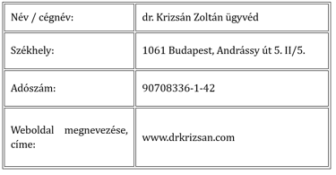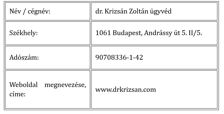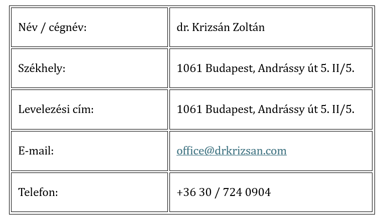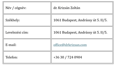Die Inhalte der Website sind urheberrechtlich geschützt. Diese Website wird von Dr. Zoltán Krizsán, einem beim Budapester Anwaltskammer unter der Registrierungsnummer (KASZ) 36082000 eingetragenen Rechtsanwalt, in Übereinstimmung mit den geltenden Gesetzen und internen Vorschriften betrieben. Diese Vorschriften sowie Informationen zu Mandantenrechten finden Sie unter www.magyarugyvedikamara.hu.