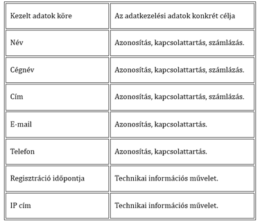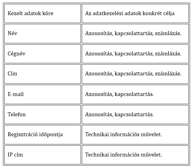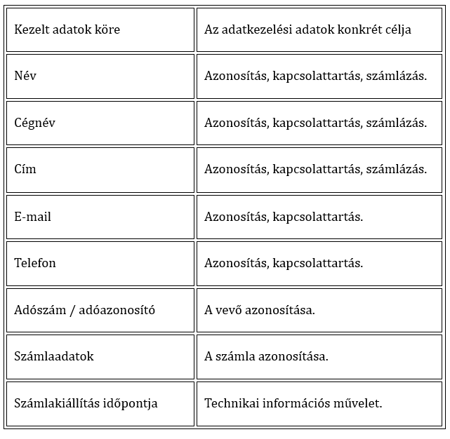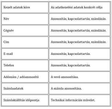 Az adatkezelés célja elektronikus számla kiállítása és küldése e-mail mellékletként.