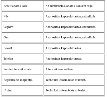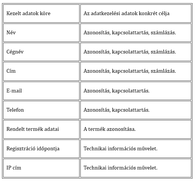 Az adatkezelés célja többletszolgáltatás nyújtása, kapcsolatfelvétel, visszaigazoló e-mail küldése. Az Ön megrendelését csak akkor tudjuk teljesíteni, ha megadja kapcsolattartási és számlázási adatait, amelyek feltétlenül szükségesek a kapcsolattartás és számlázás miatt.